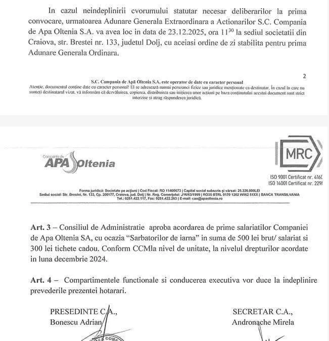În paralel cu creșterea tarifelor, Consiliul de Administrație al Companiei de Apă Oltenia SA a avizat acordarea unor prime și tichete cadou angajaților cu ocazia sărbătorilor de iarnă. Documentul oficial prevede o primă brută de 500 lei și tichete cadou în valoare de 300 lei, în total 800 lei/angajat.