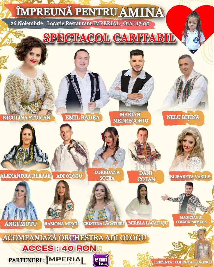 Fetița suferă de nanism și complicații grave, inclusiv chisturi cerebrale recente, iar mama ei a dezvăluit că Amina a trecut prin trei operații la picior și urmează alte intervenții. Spectacolul caritabil reunește artiști care vor cânta gratuit, contribuind astfel la strângerea banilor necesari.