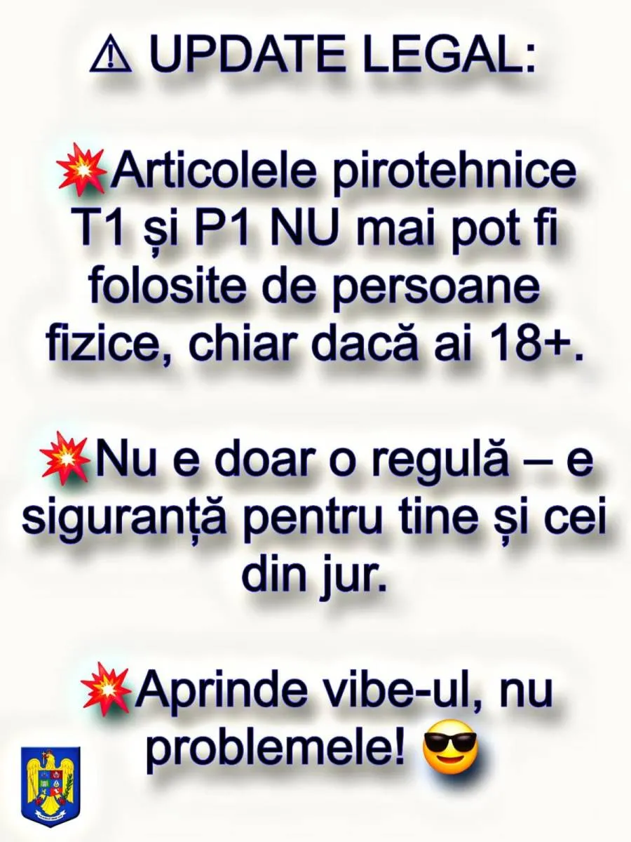 Conform noilor reglementări, articolele pirotehnice din categoriile T1 și P1 nu vor mai fi accesibile persoanelor fizice, indiferent dacă acestea au peste 18 ani. Măsura a fost adoptată pentru a preveni riscurile generate de utilizarea acestor materiale.