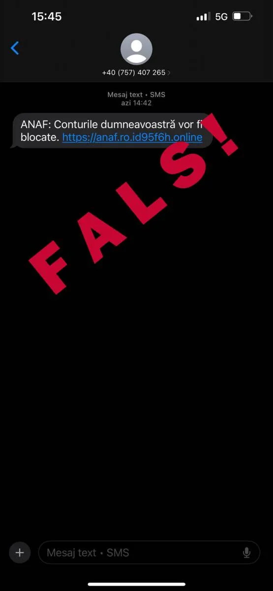 Mai mulți cetățeni au primit recent mesaje SMS care îi informează, în mod fals, că le-au fost poprite conturile bancare. Aceste mesaje îi îndrumă pe utilizatori să acceseze un link pentru a obține mai multe informații. Conform informațiilor furnizate de ANAF, aceste mesaje nu provin de la instituție și au ca scop furtul datelor personale și financiare ale utilizatorilor.
