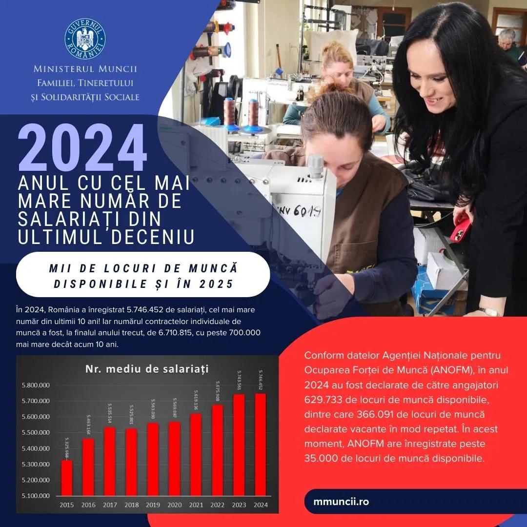 Ministrul Muncii, Simona Bucura-Oprescu, explică această creștere prin implementarea unor măsuri eficiente în ultimii ani. "Politicile de ocupare, creșterea competențelor angajaților și sprijinul oferit angajatorilor sunt priorități ale acestui mandat. Rezultatele din 2024 confirmă eficiența măsurilor pe piața muncii, iar noi continuăm investiția în oameni prin programe care să creeze noi locuri de muncă pentru români", afirmă oficialul.